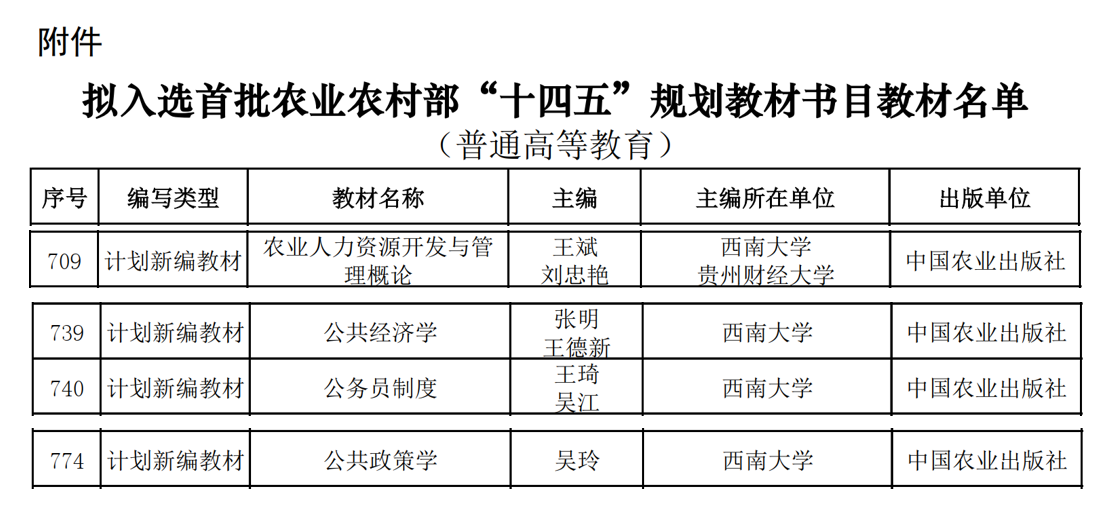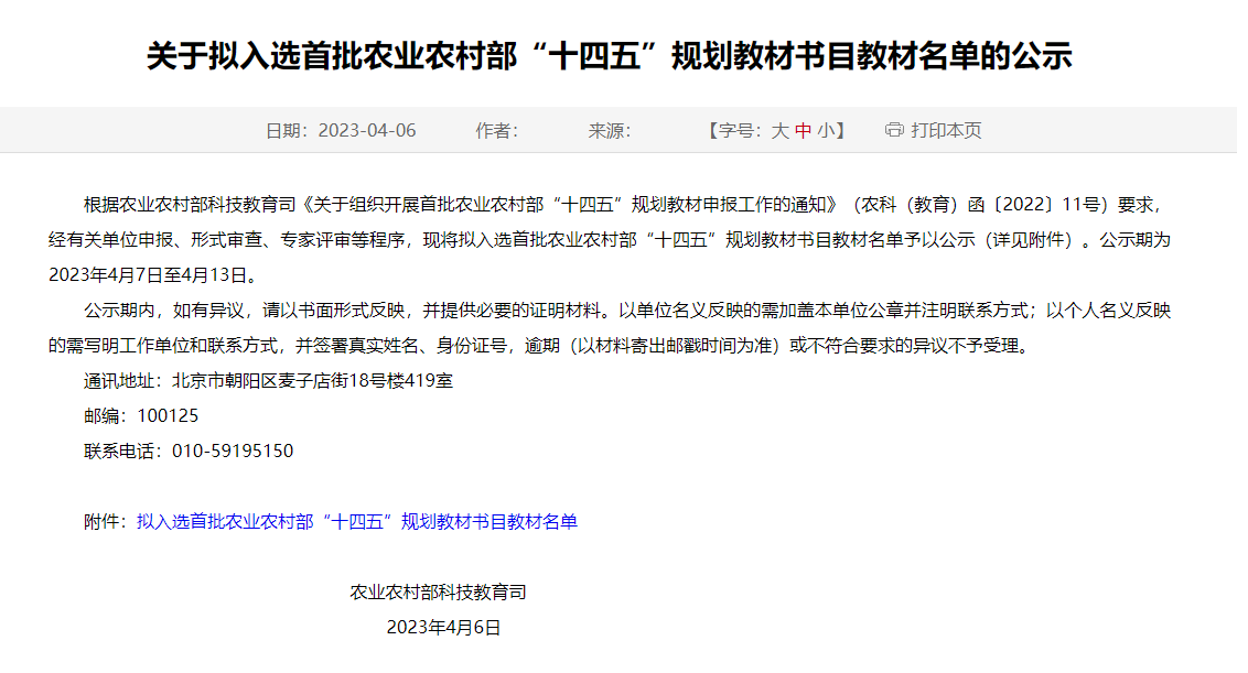 2023年4月6日,农业农村部科技教育司发布《关于拟入选首批农业农村部“十四五”规划教材书目教材名单的公示》,学院4部教材成功进入首批农业农村部“十四五”规划教材书目教材名单。