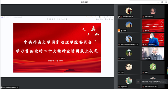 发布时间: 2022-12-13 21:49:23 已阅读:12月13日下午,学院党委在“云端”举行学习贯彻党的二十大精神宣讲团成立仪式。学院党委委员、纪委委员、专家组成员参加会议,会议由学院党委书记吴江主持。