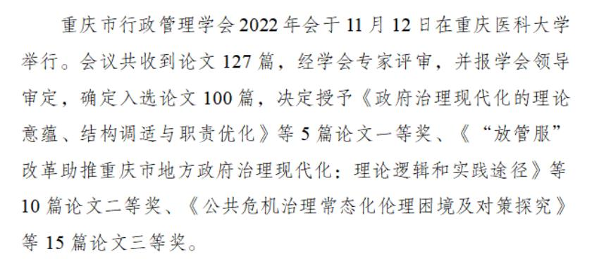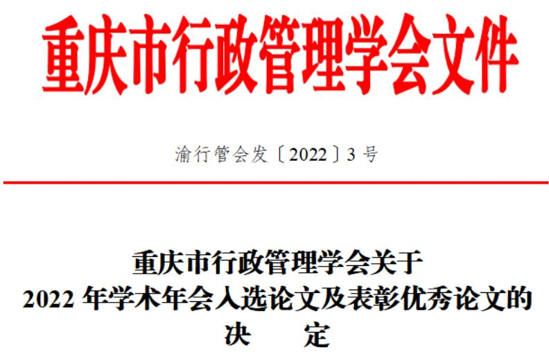 2022年12月17日,重庆市行政管理学会2022年年会暨“学习贯彻党的二十大精神 加快推进政府治理现代化”学术研讨会在线上举行。公共管理系教师、研究生和军转干部学员认真学习二十大报告精神,积极开展理论与实践研究,投稿12篇,其中行政管理专业研究生李文琢、重庆市基层治理共同体研究中心主任、1946伟德国际源自英国党委书记吴江教授撰写的《重庆市乡村振兴与新型城镇化协同发展:理论逻辑、现实困境与实践路径》获一等奖,李婧妍、王斌撰写的《“放管服”改革助推重庆市地方政府治理现代化:理论逻辑和实践路径》、军转干部学员方宇、王斌撰写的《困境与突破:城市社区应急管理体系的实践》获二等奖,李莹、吴江撰写的《成渝地区双城经济圈公共服务共建共享的难点与支点》、魏瑶瑶、公共管理系副主任张明教授撰写的《公共危机治理常态化伦理困境与对策研究》获三等奖。