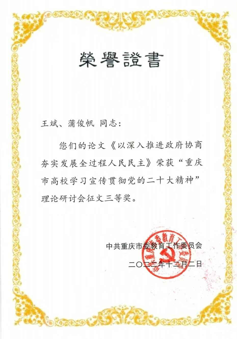 2022年12月2日,由中共重庆市委教育工作委员会主办、重庆邮电大学承办的重庆市高校学习宣传贯彻党的二十大精神理论研讨会,通过线上形式举行。研讨会采取以文入会、择优入会的方式开展,重庆市基层治理共同体研究中心王斌教授与行政管理专业研究生蒲俊帆同学撰写的文章《以深入推进政府协商夯实发展全过程人民民主》获得二等奖。论文紧扣二十大精神,提出深入推进政府协商,必须在坚持党的全面领导下,以统筹为途径完善协商关系、以平台为载体健全协商机制、以制度为基础提升协商效能,以进一步夯实发展全过程人民民主,强化广泛性、真实性与管用性。
