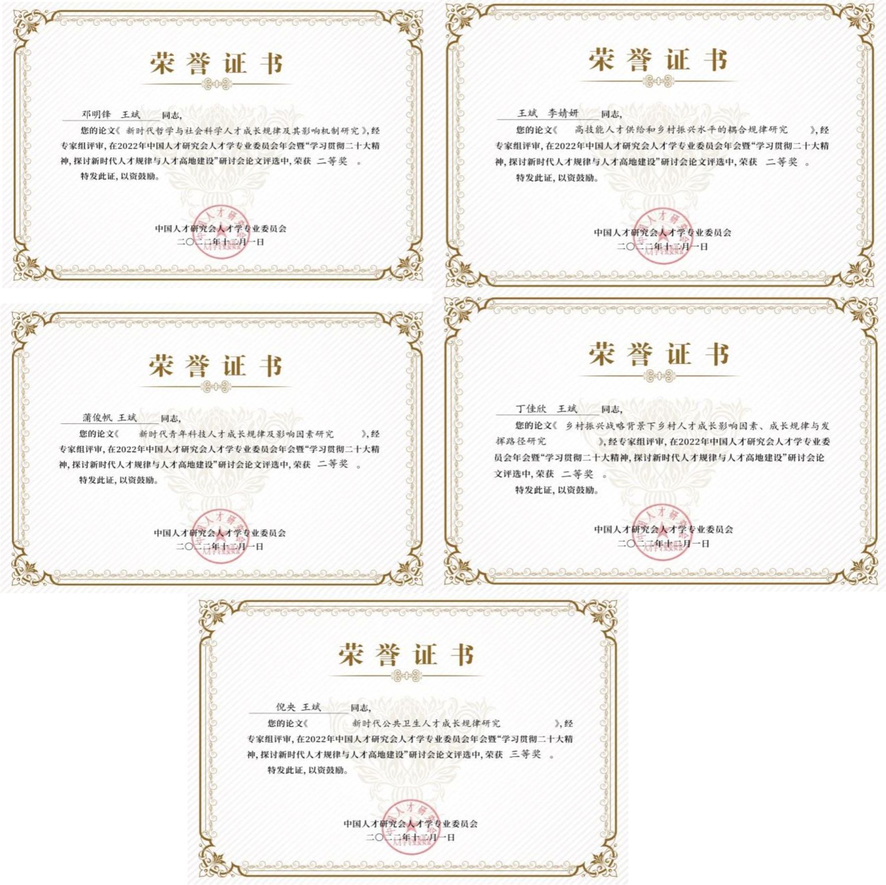 2022年11月26日,由中国人才研究会人才学专业委员会主办的2022年年会暨“学习贯彻党的二十大精神 探讨新时代人才规律与人才高地建设”研讨会顺利召开。公共管理系行政管理专业研究生李婧妍、蒲俊帆、丁佳欣、邓明锋、倪央五位同学,在导师王斌教授的指导下,积极撰写研究论文投稿参会,获得二等奖4项,三等奖1项。