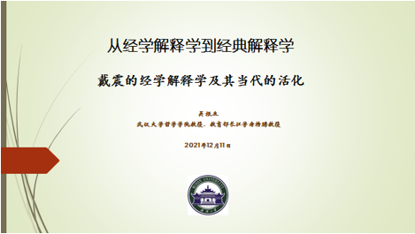 发布时间: 2021-12-20 09:02:37 已阅读:应“两江应用哲学论坛”的邀请,著名中国哲学专家、武汉大学哲学学院吴根友教授于12月17日晚为学院师生在线带来一场题为“从经学解释学到经典解释学——戴震的经学解释及其当代的活化”的讲座。讲座由学院哲学学科带头人任丑教授主持。