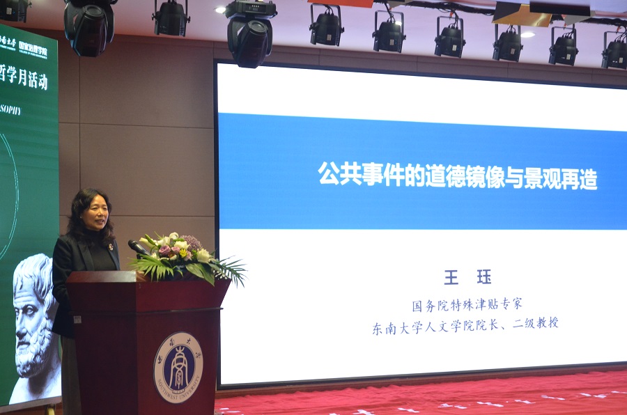 东南大学人文学院院长、博士研究生导师王珏教授带来主旨演讲《公共事件的道德镜像与景观再造》。王珏教授以事件是社会发展与道德变迁的关键处为引论展开演讲。她以1912年推翻帝制,全新的伦理景观为第一阶段,详细讲述了以“剪辫运动”“易服运动”为代表的破皇权,以“女子放足”“男女平等”“一夫一妻”为代表的破夫权,以“自由婚姻”“父子平等”为代表的破父权,和以“平等的社交礼俗”“人际称呼的平等化”为代表的倡新民四方面特点。在第二阶段1949年中华人民共和国成立,革命的伦理景观中则指出了初步建立社会主义道德体系、政治统率一切,道德政治化、巩固延安时期道德进步成果、苏联模式的影响这四类现象。在1978年改革开放,丰富变动的伦理景观的第三阶段中提出了两条特点,即社会转型、道德变迁中的伦理坚守和多元、多样、多变时代的道德状况与价值呼唤。王珏教授的演讲从以上三阶段展现了中国社会从传统道德向现代道德的变迁。