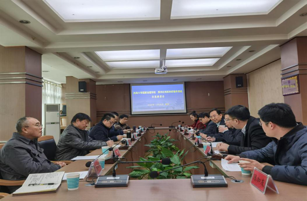 发布时间: 2020-12-01 15:17:49 已阅读:11月29日上午,我院党委书记吴江、院长潘孝富、逻辑与智能研究中心名誉主任何向东、副院长郭美云、哲学系主任陶林、哲学一级学科负责人任丑等一行7人赴贵州省社科院开展座谈交流,贵州省社科院院长张学立、党政办公室主任王跃斌、科研处处长许峰、智库工作处处长谢忠文、《贵州社会科学》编辑部副主任李桃、编辑部编辑陈加友、人事处人才科副科长朱玙含等参加了座谈会。座谈会由贵州省社科院院长张学立主持。