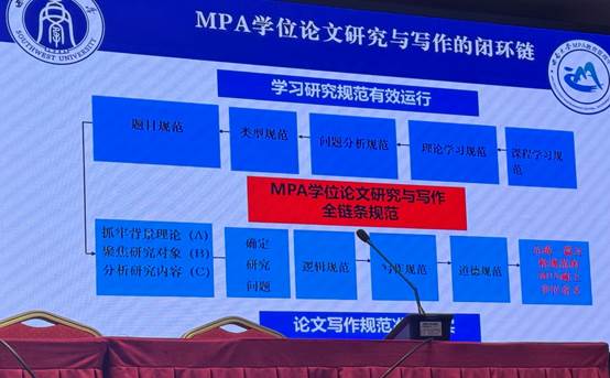 MPA学位论文写作基本规范方面,王斌教授以“如何才能规范的写出MPA论文?”为题目引入主讲内容,分别从学术规范和写作规范两个维度说明MPA学位论文写作应该遵循的基本规范,重点从研究方向、论文类型、研究方法、研究内容、论文逻辑以及文字语言的写作规范展开了详细讲解。