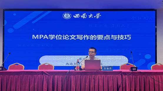 MPA学位论文写作要点与技巧方面,张福磊副教授讲解了MPA学位论文类型的联系与区别,举例说明各类型论文的写作注意事项,强调了在论文结构、内容和形式上应遵循的规范,对论文章节设计进行了详细的讲解,并希望同学们保持认真的态度对待学位论文写作。