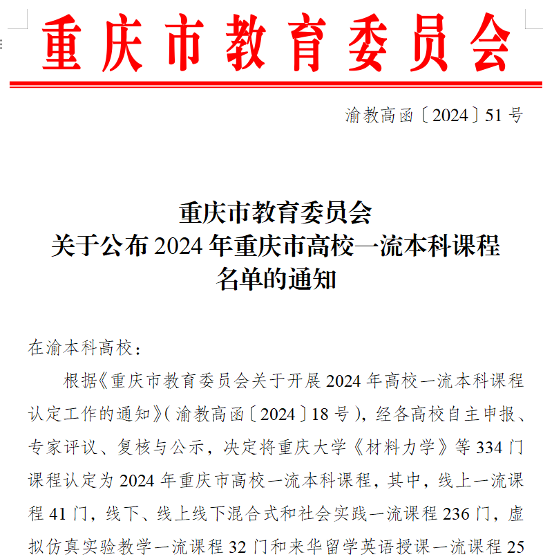 4年来,学院致力于加强一流课程及课程团队建设,现有1门国家级一流本科课程、11门重庆市一流本科课程。学院以推进一流本科专业建设为契机,不断提高课程建设质量,切实提升课程育人水平。