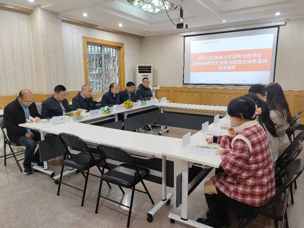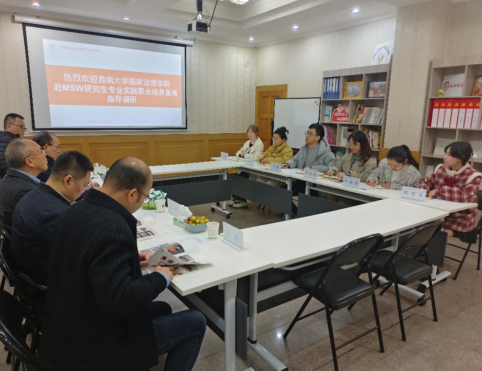 发布时间: 2024-12-06 09:19:57 已阅读:为顺应新时代专业学位研究生培养工作要求,加强与社会工作专业机构在研究生联合培养领域的深度合作,12月4日上午,校研究生教育指导专家委员会委员陶林,学院院长潘孝富、副院长郭美云,社会学与社会工作系系主任、学院督导代表宋辉,社会工作硕士专业学位研究生教育管理中心副主任马震越社会工作硕士专业学位研究生专业实践校内指导教师代表兰剑一行赴重庆市渝北区禾木社会工作服务中心进行专业学位研究生联合培养基地督导调研交流。
