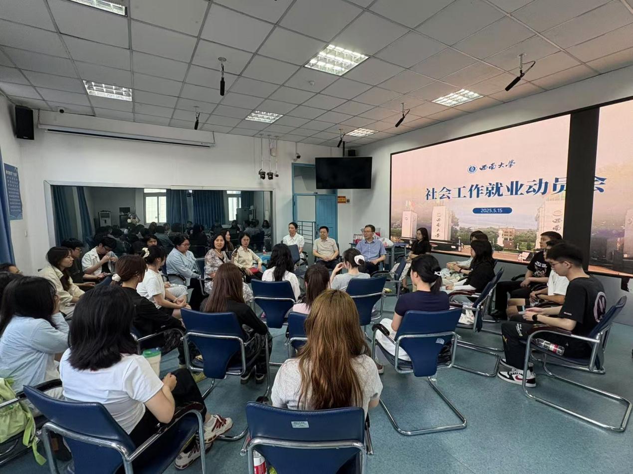 发布时间: 2025-05-19 11:43:18 已阅读:为帮助社会工作专业2025届毕业生明晰职业方向、解答就业困惑,5月14日,社会学与社会工作系在17教308教室召开就业动员会。副院长何健教授、系主任宋辉教授及多位专业教师出席动员会,师生们围绕就业、考研、职业规划等主题展开深入交流,老师们为毕业生提供针对性建议与资源支持。
