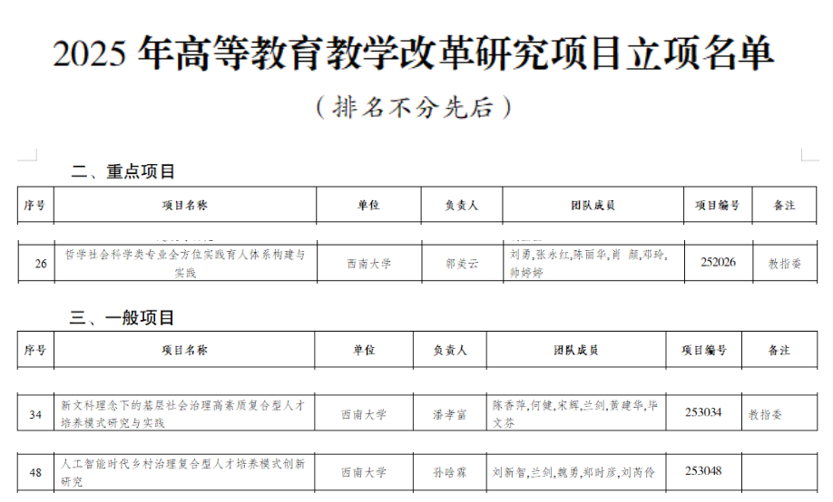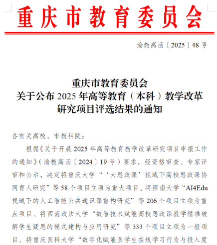 发布时间: 2025-09-03 16:07:52 已阅读:近日,重庆市教育委员会印发《关于公布2025年高等教育(本科)教学改革研究项目评选结果的通知》(渝教高函〔2025〕48号)。我院申报的3项教育教学改革研究项目获准立项,含重点项目1项、一般项目2项。