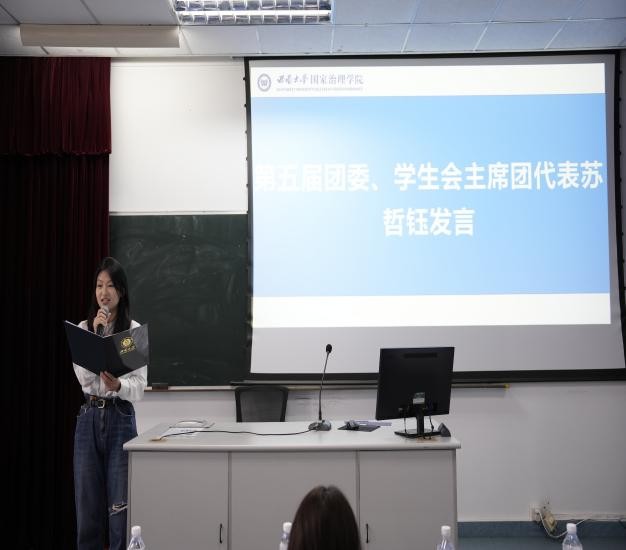 第五届团委学生会主席团代表苏哲钰发言,她表示团委学生会是凝聚学生力量的大家庭,希望学弟学妹们能够拥抱不同、追求大同,各部门包容协作,在工作实践中体验共赢的快乐,并知足于心、担责于身。