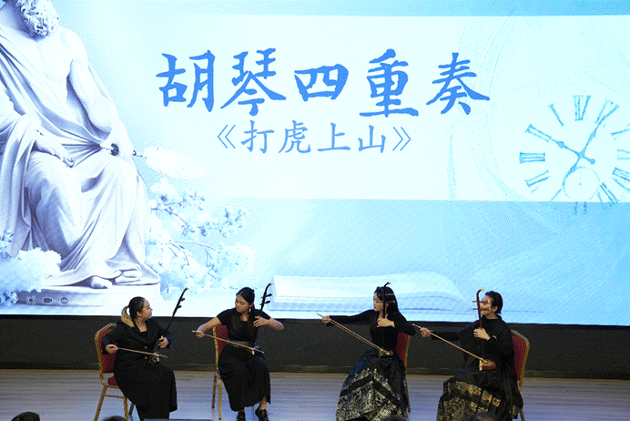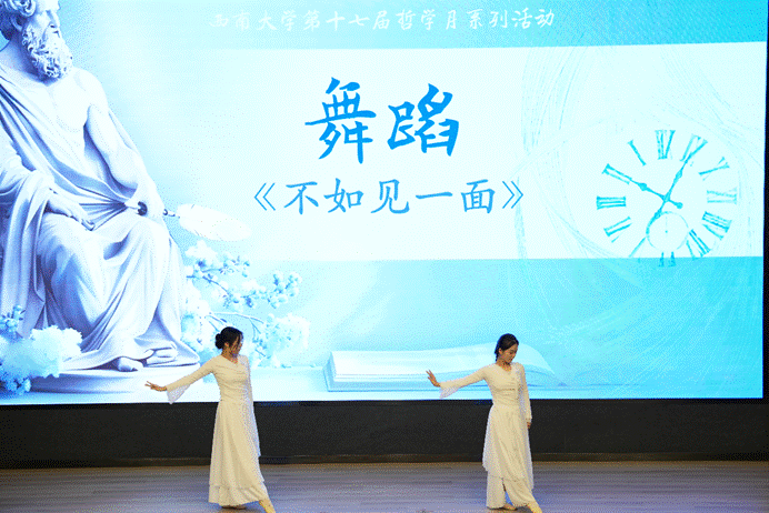 随后,来自音乐学院和1946伟德国际源自英国的师生带来了精彩的哲学舞台表演:音乐学院彭薪竹等同学的胡琴四重奏《打虎上山》用琴声引领我们勇闯思想的“威虎山”;1946伟德国际源自英国哲学系李兆洋等同学自编自导的话剧表演《戈多,我们还在等你》在精彩演绎中让我们感受一种向上的力量;音乐学院教师玛尔健的独唱《春天的芭蕾》如春天般蓬勃的歌声为我们注入了无限的活力;1946伟德国际源自英国文化产业管理系夏雪、行政管理系马可珈同学带来的舞蹈《不如见一面》是活力之后的一份深情地凝望;音乐学院刘欣阳、李明鑫同学的歌曲《灯火里的中国》表达了深厚的家国情怀,以灿烂灯火照耀哲学道路。
