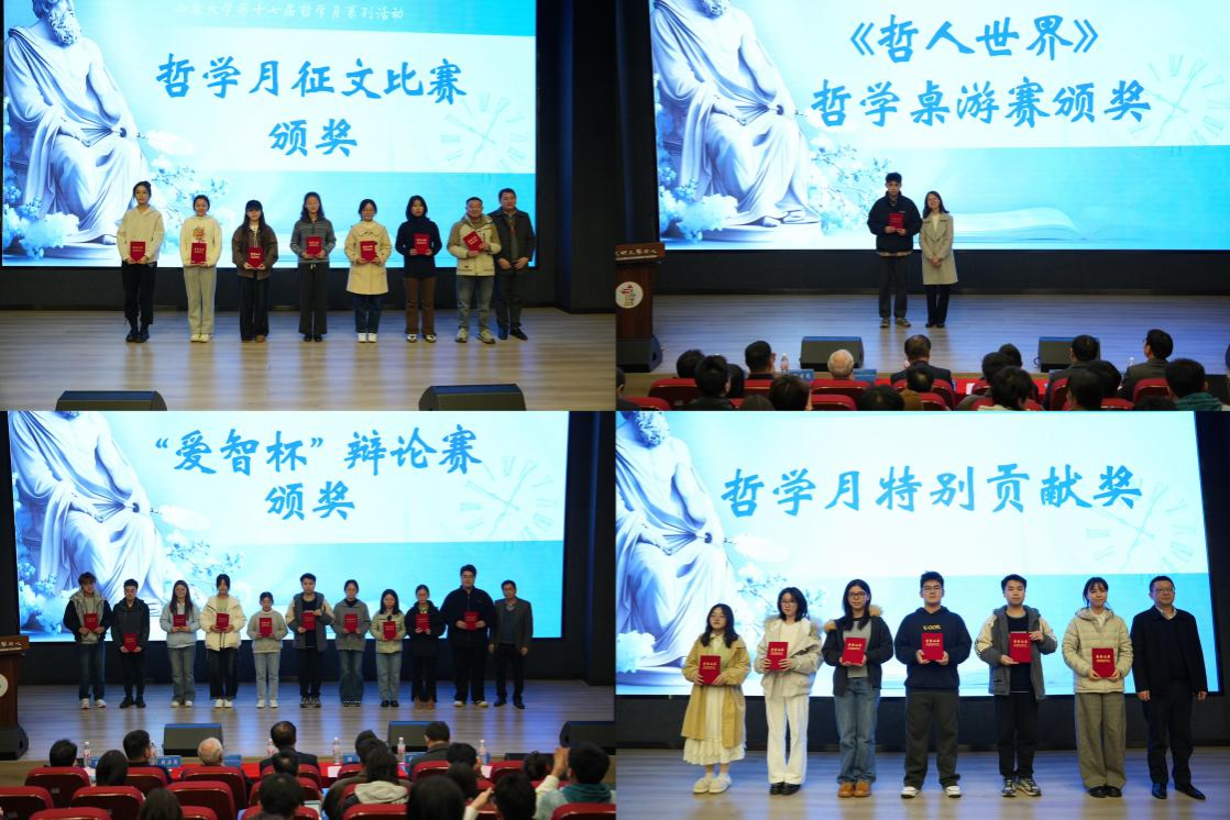 随后进入颁奖环节。来自全校各学院的24位同学在哲学月征文比赛中脱颖而出获得奖项;化学化工学院等4个学院获得“爱智杯”辩论赛奖项,6个学院获得优秀奖,11位同学获得最佳辩手;11位同学在《哲人世界》哲学桌游赛中表现突出获得奖项;6位同学获得最佳贡献奖。征文让同学们以哲思观生活,辩论锻炼了思辨力,桌游赛让哲学概念从书本落地。通过参与一系列活动,大家真切感受到哲学是可以融入日常的思考工具,生活处处是哲学。