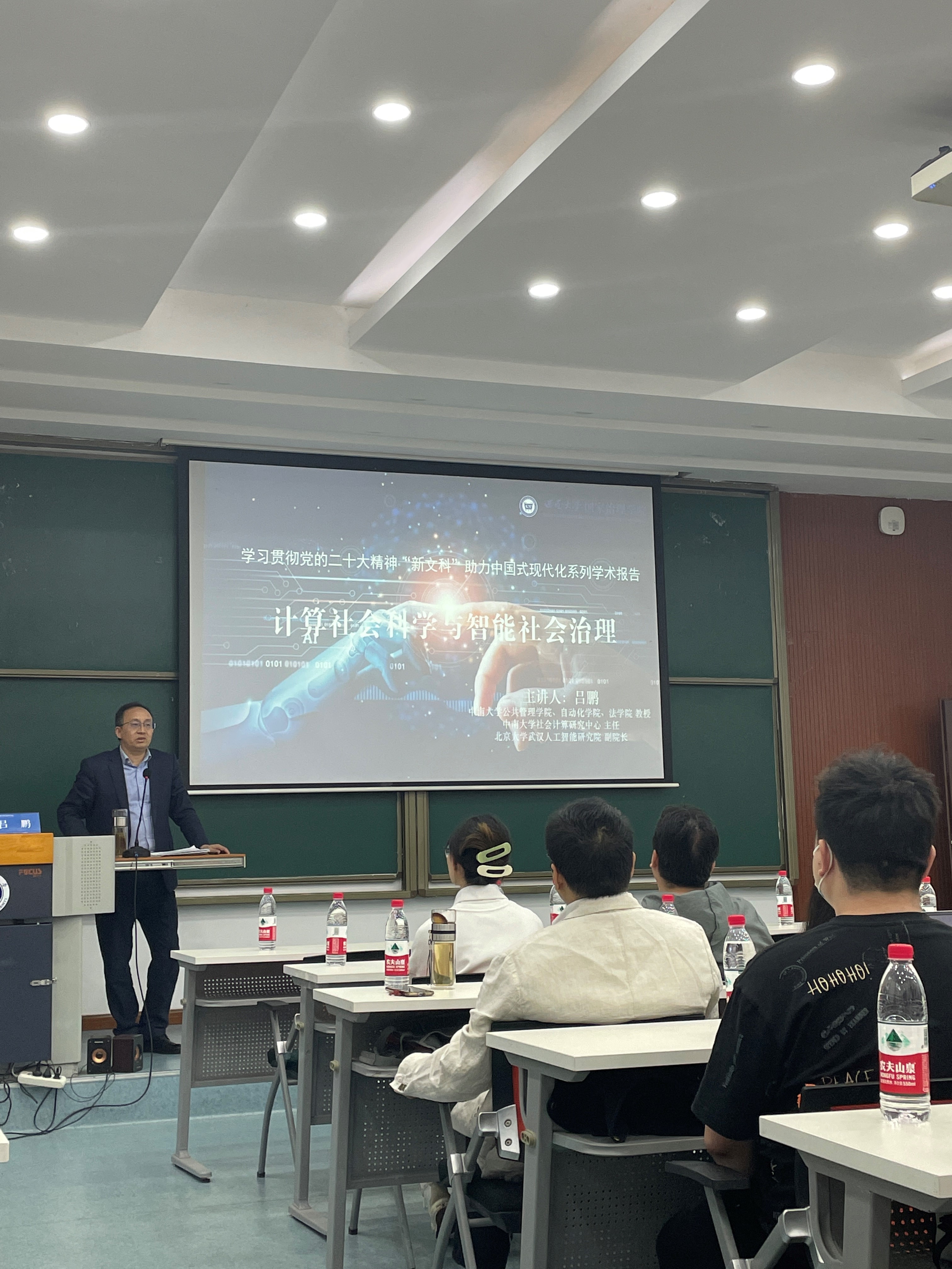 2023年5月11日下午,“新文科”助力中国式现代化系列学术报告第六讲在绩镛楼3308顺利举行。中南大学公共管理学院、自动化学院、法学院教授,中南大学社会计算研究中心主任,北京大学武汉大学人工智能研究院副院长吕鹏教授讲授了主题为《计算社会科学与智能社会治理》的学术报告。1946伟德国际源自英国院长潘孝富教授主持本次讲座。