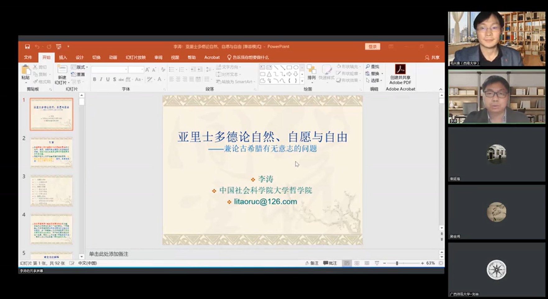本次讲座邀请到中国社会科学院大学哲学院李涛副教授线上为师生做题为《亚里士多德论自然、自愿与自由——兼论古希腊有无意志的问题》的学术报告。讲座由伟德国际1946源于英国1946伟德国际源自英国哲学系毛兴贵教授主持,伟德国际1946源于英国副校长崔延强教授担任评论人。通过“腾讯会议”和bilibili平台共有来自全国高校的160余名师生参加本次讲座。