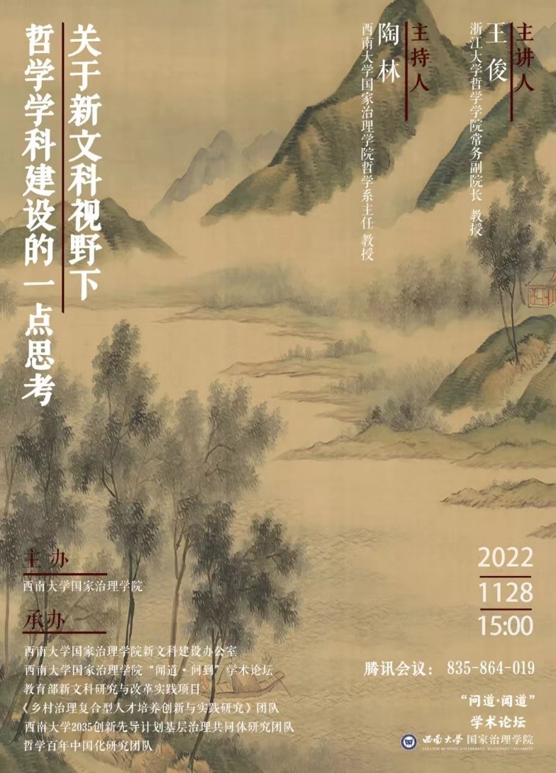 2022年11月28日下午,“新文科”助力中国式现代化系列学术报告第二讲通过线上顺利举行。浙江大学哲学学院常务副院长、外国哲学研究所所长,教育部国家级人才称号获得者王俊教授作题为《关于新文科视野下哲学学科建设的一点思考》的学术报告。该场学术报告由学院哲学系主任陶林教授主持,潘孝富院长致欢迎辞,来自全国高校的近百名师生通过腾讯会议聆听。