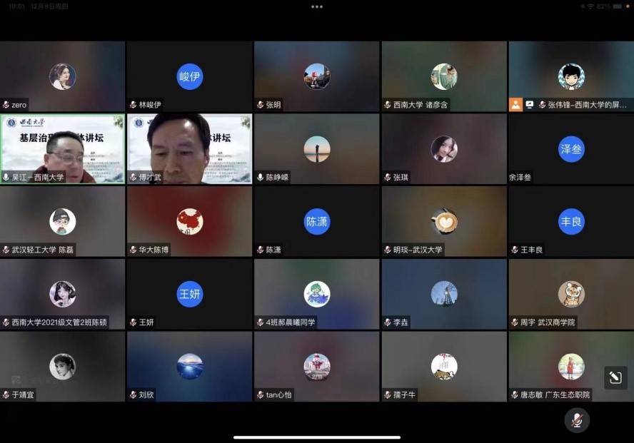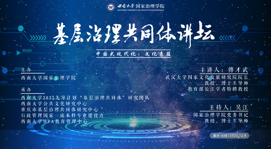 发布时间: 2022-12-11 11:47:30 已阅读:2022年12月8日晚19:00,由1946伟德国际源自英国主办,伟德国际1946源于英国2035先导计划基层治理共同体研究团队、伟德国际1946源于英国公共文化研究中心、重庆市基层治理共同体研究中心、行政管理国家一流本科专业建设点、伟德国际1946源于英国MPA教育管理中心联合承办的基层治理共同体讲坛顺利举行,共有来自武汉大学、同济大学、南京大学、伟德国际1946源于英国等全国多所院校的近300名专家学者及学生通过“腾讯会议”APP,以线上的形式参加了此次学术报告活动。