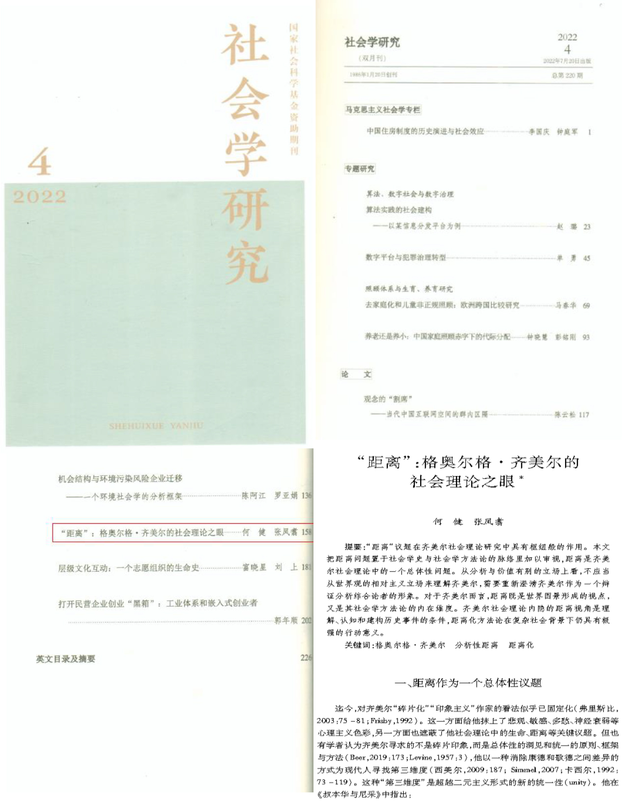 发布时间: 2022-09-29 17:38:05 已阅读:近日,1946伟德国际源自英国何健老师、硕士研究生张凤翥合作的《“距离”:格奥尔格·齐美尔的社会理论之眼》一文在《社会学研究》2022年第4期发表。该文认为:“距离”议题在齐美尔社会理论研究中具有枢纽般的作用。把距离问题置于社会学史与社会学方法论的脉络里加以审视,距离是齐美尔社会理论中的一个总体性问题。从分析与价值有别的立场上看,不应当从世界观的相对主义立场来理解齐美尔,需要重新澄清齐美尔作为一个辩证分析综合论者的形象。对于齐美尔而言,距离既是世界图景形成的视点,又是其社会学方法论的内在维度。齐美尔社会理论内隐的距离视角是理解、认知和建构历史事件的条件,距离化方法论在复杂社会背景下仍具有极强的行动意义。