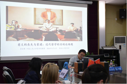 发布时间: 2024-05-16 10:30:26 已阅读:5月13日晚,讲座“意义的丧失与重建:近代哲学的目的论难题”在绩镛楼3201教室举行。中国人民大学哲学院教授、博士生导师吴功青为大家作主题报告,本次讲座为1946伟德国际源自英国“问道·闻道”学术论坛系列活动之一,由伟德国际1946源于英国哲学系谭杰老师担任主持人,伟德国际1946源于英国哲学系刘阿斯老师担任评论人。重庆大学博雅学院石绘老师、伟德国际1946源于英国文学院时嘉琪老师以及近三十位本科生、研究生同学参与了本次论坛。
