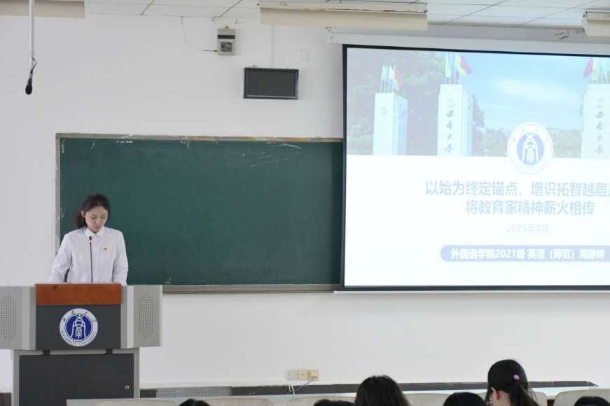 外国语学院周静婷同学以“将教育家精神薪火相传”为主题,讲述了自己大学四年的成长历程。她提到,同学们应当在课内脚踏实地、在课外积极拓展,善于借鉴他人经验,在实践中不断提升自己的综合素养。