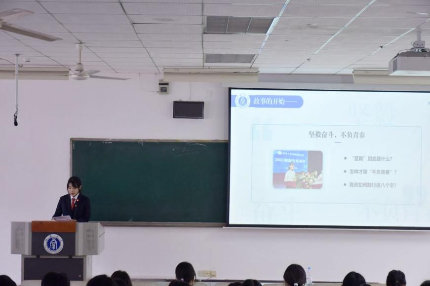 经济管理学院崔舒妍同学围绕“坚毅”一词,鼓励同学们“让决心和毅力成为人生底色”。她强调,应当在学习与生活之间均衡分配精力,实施高效且合理的时间管理,并执行严格的自我管控。
