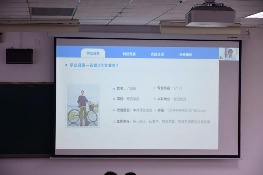 商贸学院卢帅超同学通过视频形式进行了远程分享。他以自己与国奖失之交臂的经历为切入点,建议大家要学会调整心态,更加注重成长过程而非单纯追求结果。同时,他提出了三点建议:一是要尽早做好职业规划;二是要保持自己的学习节奏,避免盲目内卷;三是要有针对性地进行努力。