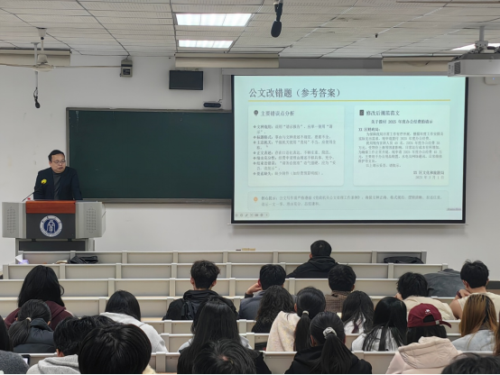 讲授环节,王家荣围绕公文写作核心要点展开讲解。他先系统梳理公文定义、法定文种及格式规范,从公文眉首、主体到版记,逐要素拆解标准要求,针对发文机关标识、标题拟定、正文逻辑、落款日期等常见易错点,结合典型案例对比分析,帮助学生快速掌握公文“规范、严谨、务实”的核心特质,纠正日常写作中的认知误区。