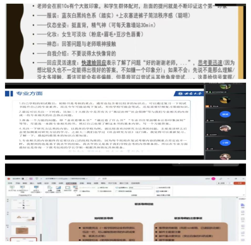 复试经验分享会从复试问题、书目推荐、技巧方法、仪容仪表,心态调整等方面为同学们进行讲解,引导同学们放平心态,积极应对考研复试。就读于四川大学的简丽敏学姐强调复试问题应对的准备需要在专业知识的基础上对时事热点进行理性分析,最终形成自己的观点;就读于复旦大学的史钰群学姐表示面试前应注意个人形象、多调试设备、保持面试场景干净整洁,并结合自身经验向同学们传授了更好地展现出自己的专业实力的方法。就读于电子科技大学的赵芷墨学长对联系导师的方法和注意事项为同学们做了详细分享。此外,其他学长学姐也认真地从专业特点、面试技巧、调剂经验等方面与同学们进行了深入的分享与交流。