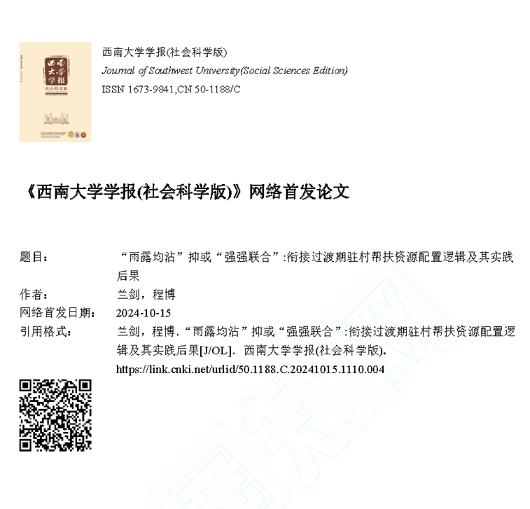 发布时间: 2024-11-01 12:42:20 已阅读:近日,我院社会学与社会工作系教师兰剑团队撰写的《“雨露均沾”抑或“强强联合”:衔接过渡期驻村帮扶资源配置逻辑及其实践后果》一文发表于《伟德国际1946源于英国学报(社会科学版)》2024年第5期。文章认为,驻村帮扶是衔接过渡期巩固好脱贫成果、接续推进乡村振兴的重要制度支撑。通过对西部地区两县驻村帮扶工作的调查研究发现,与脱贫攻坚时期更加注重全面帮扶的“雨露均沾”不同,衔接过渡期驻村帮扶资源配置更加注重“强强联合”,在乡村振兴示范点创建的工作机制与目标指引下,一些重点乡村建设项目和资源被少数优势村庄捕获,驻村帮扶强势主客体间存在着理性的“共同谋划”,而部分弱势村庄则深陷于自身基础薄弱和外来资源稀缺的两难境地。驻村帮扶主客体的“强强联合”在一定程度上导致了驻村帮扶主体的行为偏差、村际水平上新的不公平、制度效能低下与低水平管理困境等后果。因此,应加快构建驻村帮扶资源的精准匹配与县域资源统筹共享机制,拓展资源供给渠道并优化驻派结构,以提升帮扶资源配置的公平性和整体帮扶效能。