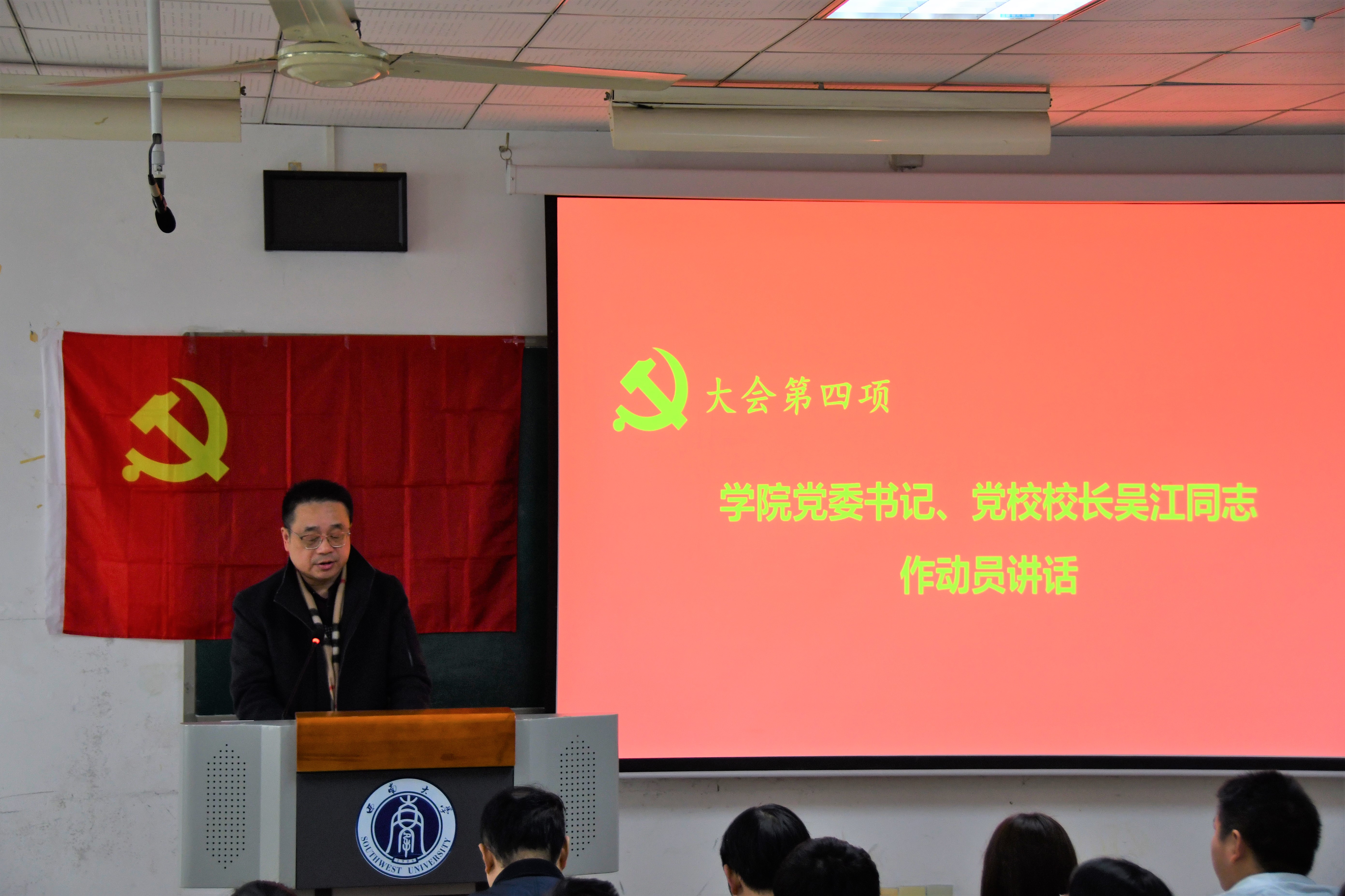 吴江书记在典礼上作动员讲话,他指出,党校是对青年学生进行系统思想教育的有效载体,希望大家能够通过党校的学习端正入党动机,明确入党初心,以自己的实际行动积极争取早日加入党组织。为此,他向学员们提出了三点要求和希望:一是认真学习、提升素养,用科学的思想理论武装头脑,不断提高自身政治素养,自觉抵制不良思想对自身的影响。二是志存高远、铸牢信念,把自己的人生追求同祖国和民族的前途命运联系起来。三是主动作为、知行合一,从根本上了解党、从情感上热爱党、从行动上追随党,在学习、思想、工作各个方面发挥先锋模范作用。