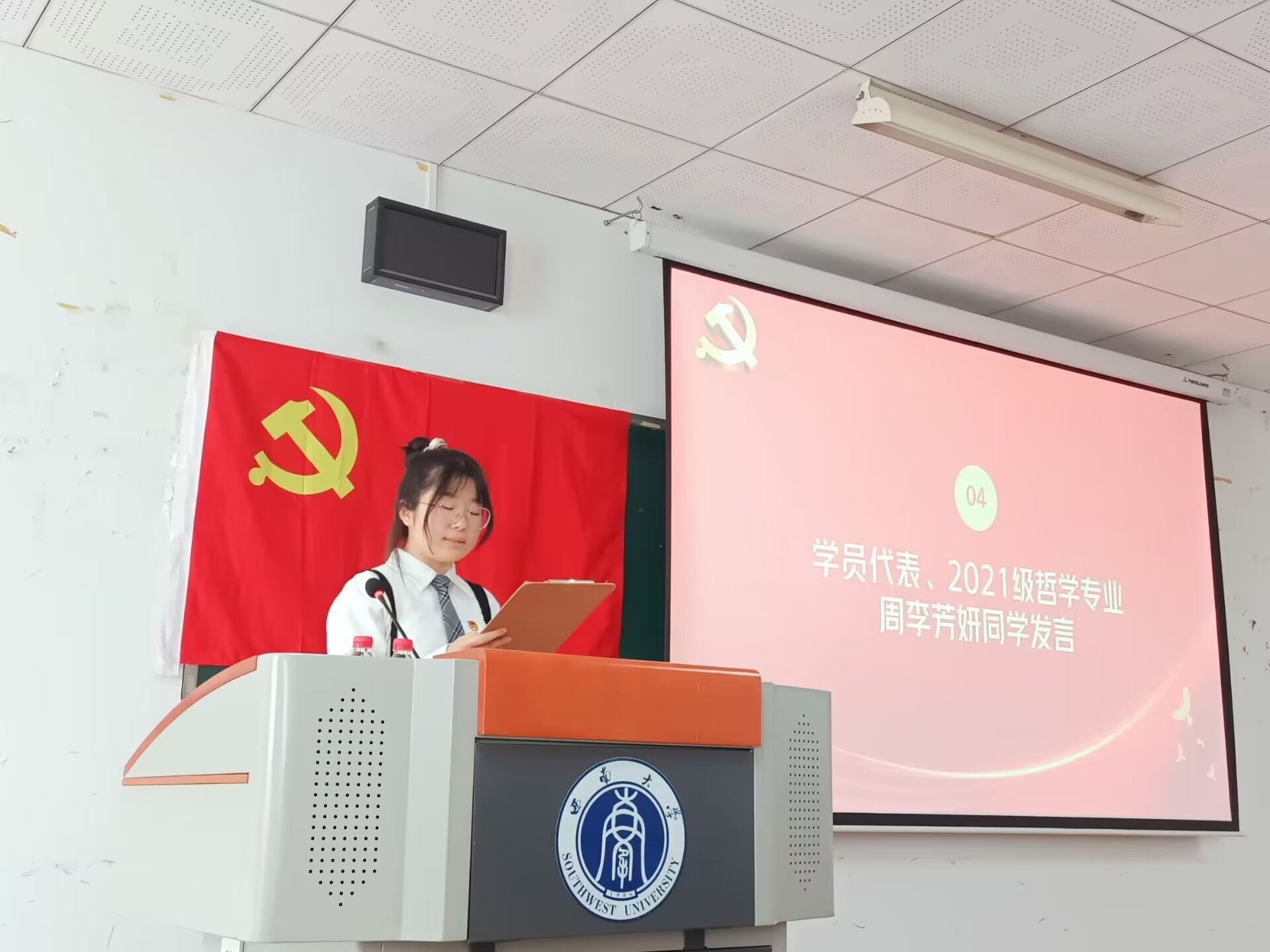 随后,由2019级政治学与行政学专业王祉璇同学作为党员代表发言,她讲述自己在大学中的“讲奉献、有作为”的学生工作经历和志愿服务经历,强调合格党员所需具备的先锋模范作用,鼓励在座学员早日成为一名合格的中国共产党员。学员代表周李芳妍在表态发言中表示,将进一步端正入党动机,做到思想上入党和组织上入党的统一、认识与实践的统一以及学习党的基本理论与学习科学文化知识的统一。