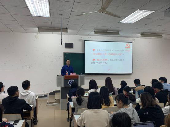 李长松老师从为什么入党、如何入党、入党后做什么这三个问题进行引入,结合自己切身例子,给学生们讲解了入党动机有哪些,什么是正确的入党动机,如何端正自身的入党动机,什么是新时代合格党员,如何成为新时代合格党员等问题。正确的入党动机应该是“信仰人民,信仰共产主义”,让我们知道,想要入党,应该在思想与行为上积极向党组织靠拢,学习并遵守我党的各项规章制度。成为新时代合格的共产党员,首先要我们端正入党动机,永思初心使命,其次要践行两学一做,永葆先进纯洁,此外,还应努力干事创业,永做时代先锋。