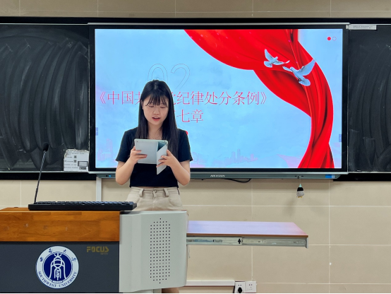 研究生第三党支部周茵、田涛、罗佳欣同志分别领学《中国共产党纪律处分条例》第六章至第八章,围绕党的政治纪律、组织纪律、廉洁纪律,讲解了党纪处分条例的最新要求。本次党纪学习教育加入了趣味问答环节,通过答题嘉奖的形式,激发了每位党员的学习热情,推动党纪学习教育走深走实。党员们纷纷表示,要认真学习条例,提高政治觉悟,坚定政治信念,保持政治纯洁,在正风肃纪中加强党性,自觉成为学纪律、懂纪律、守纪律的好青年,始终听党话、跟党走。