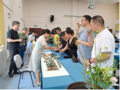 古琴演奏欣赏后,老师们对近期热播电视剧《梦华录》里的宋韵风雅之品茶、点茶、焚香和插花进行了体验。肖颜老师从温杯洁具到赏茶制茶,从润茶泡茶到斟茶奉茶,让品茶的老师在尝茶、闻香、观汤、品味中感悟茶文化的博大精深。曾琪芮老师用汤花幻化出图形,带老师们体验了宋代点茶文化。史丽老师以“静、雅、美、真、和” 的精神给现场带来了高雅的香道文化意境体验。杨钦清老师负责“巧手插花献给党”插花体验环节,老师们积极发挥创造力,施展插花技能,并在卡片上写下了对党的祝福,现场其乐融融。