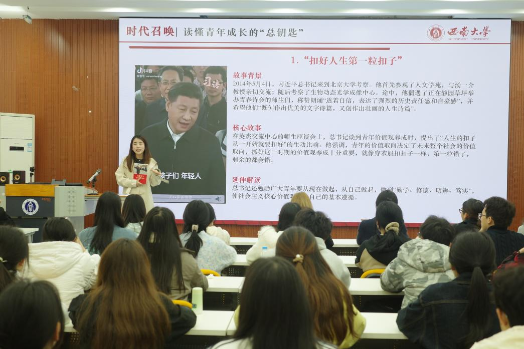 在主题讲解环节,杨钦清系统梳理了习近平总书记对青年成长成才的重要论述。通过回顾总书记考察高校的足迹和给青年学子回信的感人片段,杨钦清带领同学们重温了“扣好人生第一粒扣子”“青春是用来奋斗的”等经典论述。她强调,总书记无论是在地方工作还是担任总书记后,始终心系青年成长,一次次走进高校、一封封回信寄语,都饱含着对大学生朋友的殷切期望。