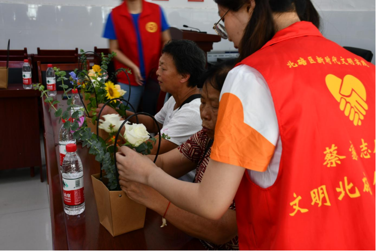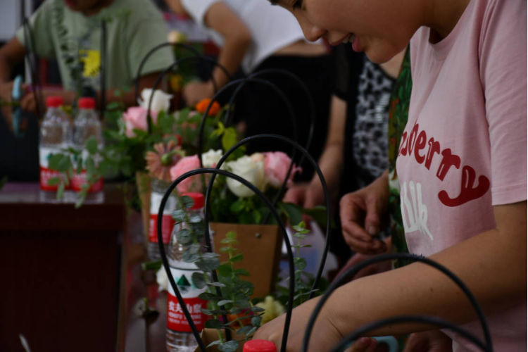 活动开始,学院“三下乡”社会实践团成员游璐介绍了插花艺术的基本知识、插花造型、器具、色彩应用及花的品种等内容。随后游璐同学向居民们展示了插花的过程并说明需要注意的事项,居民们认真聆听,为接下来动手插花做好准备。掌握基本方法后,居民们选取了自己喜欢的花材,在现场实践团成员的帮助下创作自己的插花作品,经过不断的尝试和实践,一盆盆错落有致、生机盎然、创意十足的插花作品展现在大家眼前,令人赏心悦目。