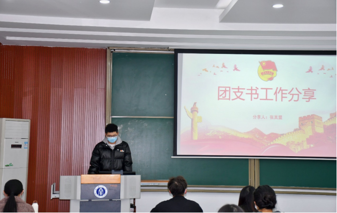 首先,2021-2022学年校级“五四红旗团支部”团支书代表张其盟同学分享了自己的工作经验。他从日常工作、文体活动、生活和制度四个方面向大家介绍了自己的工作方法与心得体会,鼓励大家积极参与团支部建设中,加强对支部成员的关心,提高团支部的凝聚力。