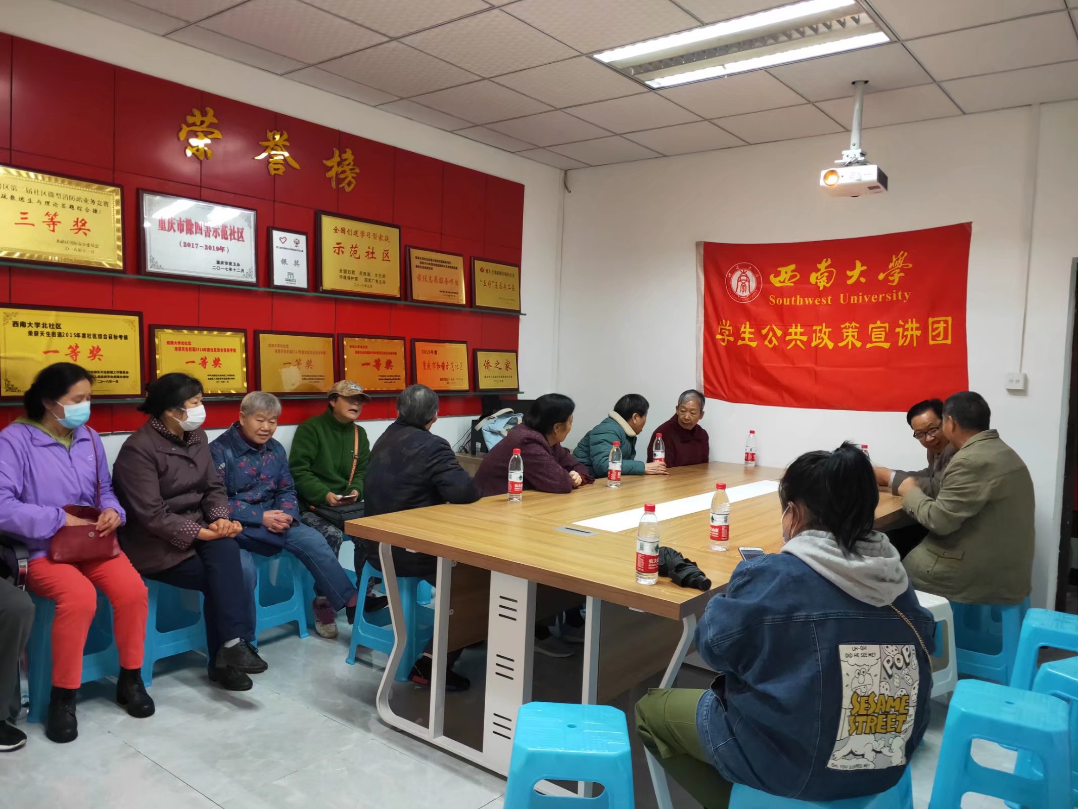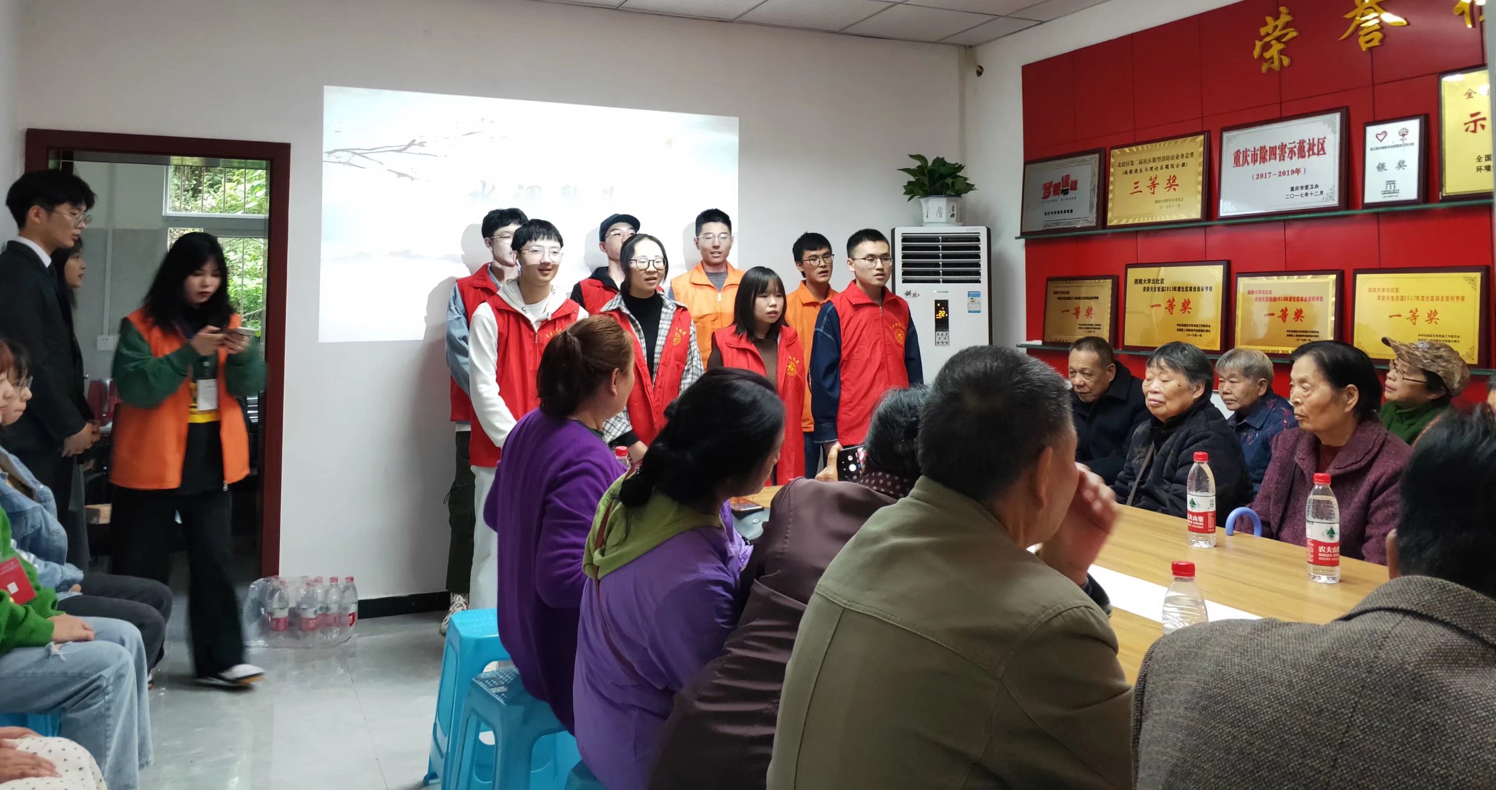 “明月几时有,把酒问青天。不知天上宫阙,今夕是何年。”我们的故事分享会在观众们的热烈讨论中,迎来了第三个环节——大合唱《水调歌头》。身穿志愿服务马甲的公宣团成员,齐唱这首以中秋节为载体,饱含着对家乡与亲人思念之情的千古绝唱。在歌曲的最后,他们代表公宣团全体成员向爷爷奶奶们送上节日的问候与衷心的祝福。大家在欣赏传统节日歌曲之余,也领略到了传统诗词的魅力。
