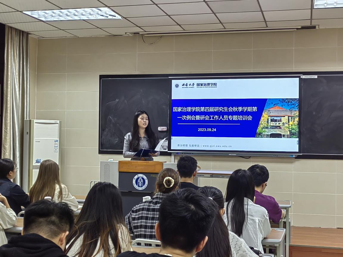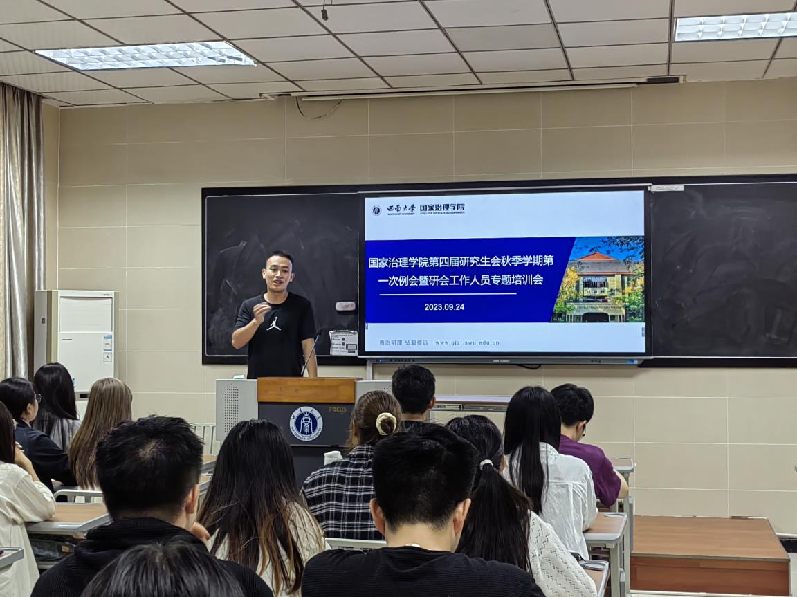 发布时间: 2023-09-28 10:41:33 已阅读:9月24日晚,我院研究生会在3101举行第四届研究生会秋季学期第一次例会暨研会全体成员专题培训会。本次会议由团委副书记徐婷主持,第四届研究生会全体成员参与。