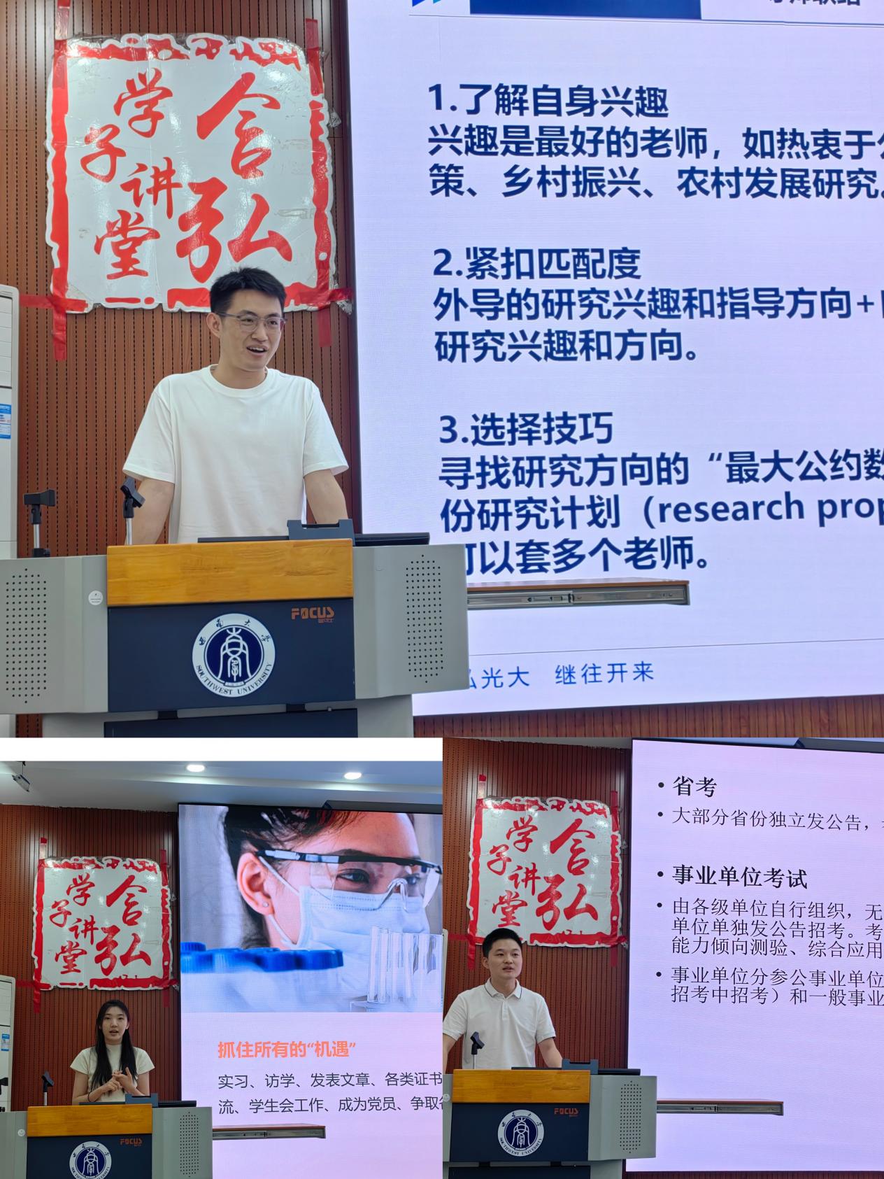 分享互动环节,2022 级公共政策专业杨平同学围绕申博主题进行经验分享。他详细介绍导师信息的获取途径、沟通技巧等内容,强调了发送研究计划的重要性,从时间流程上介绍了不同月份在申博上需要做的工作以及公派留学的具体过程。2022级社会工作专业王洁为同学以公务员及事业单位考试为核心主题,他首先梳理了国考、省考及事业单位考试的时间安排及报考条件与招录要求。提出刷题训练、专项突破、现时模拟等训练技巧,在面试环节上,要了解不同面试的题型与考察重点,保持积极心态,强化开口表达训练,并注重语速语调、面部表情、肢体语言等细节,实现自信流畅的考场呈现。2022 级社会工作专业赵培玉珠同学结合个人成长经历,围绕实习实践、访学交流、学术成果发表、学院活动参与及学术论坛研讨等多个维度,分享了求职经验。