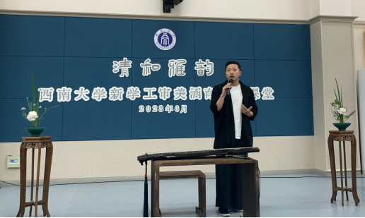 在开场视频的悠扬声中,主持人杨钦清老师宣布本次体验课堂正式开始。首先,青年古琴演奏家刘雳老师介绍了古琴的历史、指谱以及三种基本音色,并通过演奏让听众直观地感受琴音、琴曲的不同特点。《流水》若幽涧鸣泉展现大自然的生命力,《梅花三弄》不断递进,展现梅花不屈的姿态,《广陵散》曲调慷慨激昂,震撼人心。演奏完毕,刘雳老师耐心地解答了同学们对于古琴艺术的疑问,加深了同学们对中国传统音乐艺术的了解。
