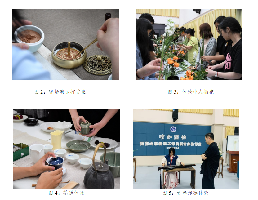 古琴演奏欣赏后,同学们对品茶、点茶、制香和插花进行了体验。曾琪芮老师通过润茶泡茶到斟茶奉茶,让品茶的同学们在闻香、观汤、品味的过程中感受到了茶文化“清”“敬”“怡”“真”的精神。史丽老师指导了同学们亲手制作香包并在演示打香篆、焚香、制香的过程中,营造了高雅的香道文化氛围。肖颜老师则带领同学们学习中式插花艺术,在一方花器中,感受山川、湖泊、沼泽等景致,创造了一个无限变化的空间。