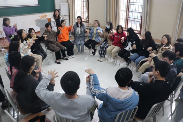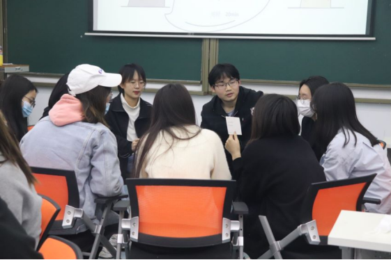 班会在学院社工团队的组织和引导下进行。活动过程中,社工团队运用了小组工作方法,设计了破冰游戏+热身游戏+主题游戏的“1+1+1”活动模式。破冰游戏(寻人游戏、帮我签个名等)有效地调动了同学们的活动兴趣,帮助大家更好地认识与了解彼此;热身游戏(阿水的故事、大风吹、永远不说我等)在破冰游戏的基础之上,进一步打破了同学们之间的隔阂,激发了同学们的活动热情;在主题游戏(指定话题介绍、最佳人缘奖)中,同学们或是围坐成圆圈,互相分享与回应话题;或是将感谢写在小纸条上,彼此传递浓浓的感恩之情。