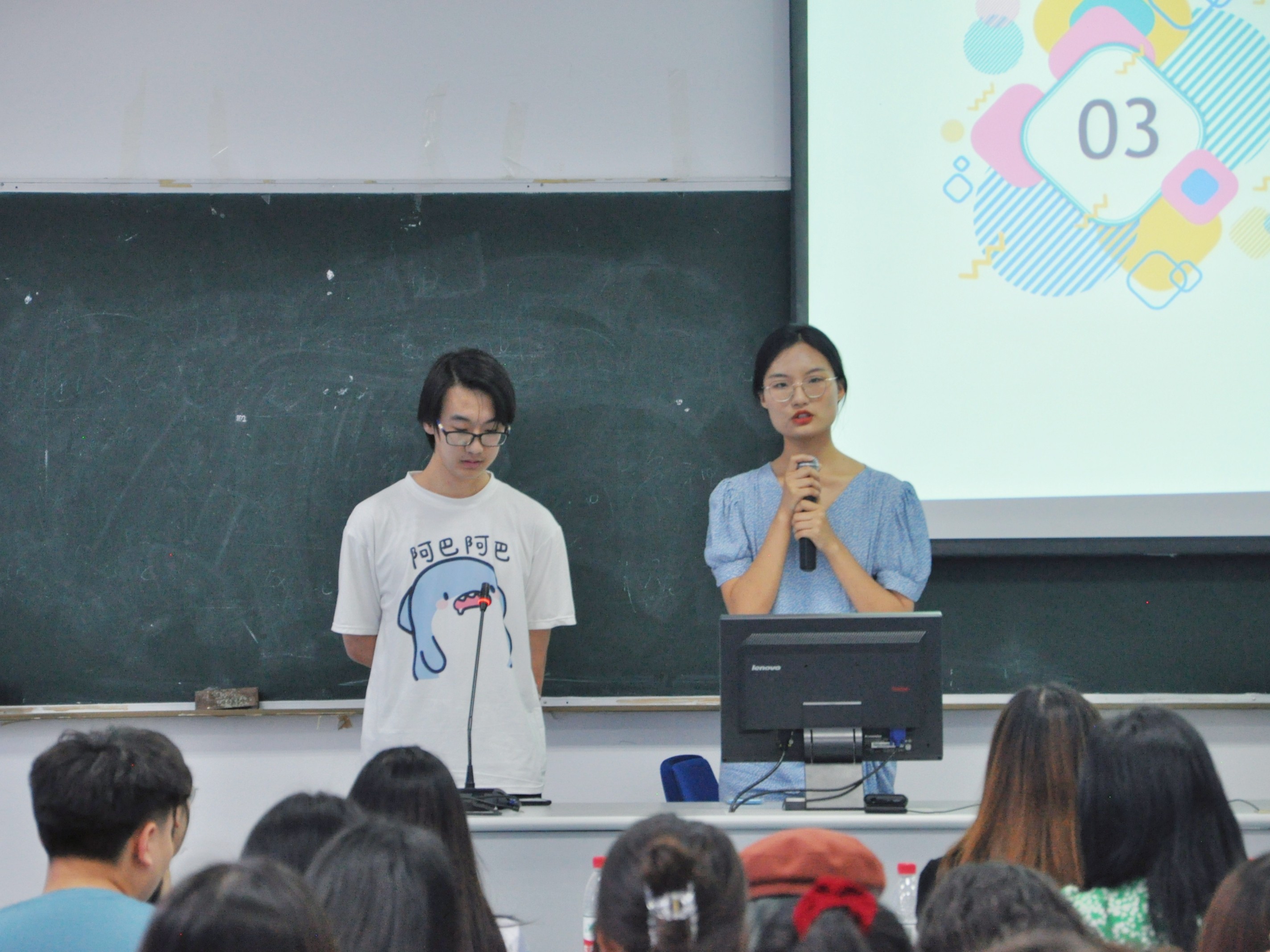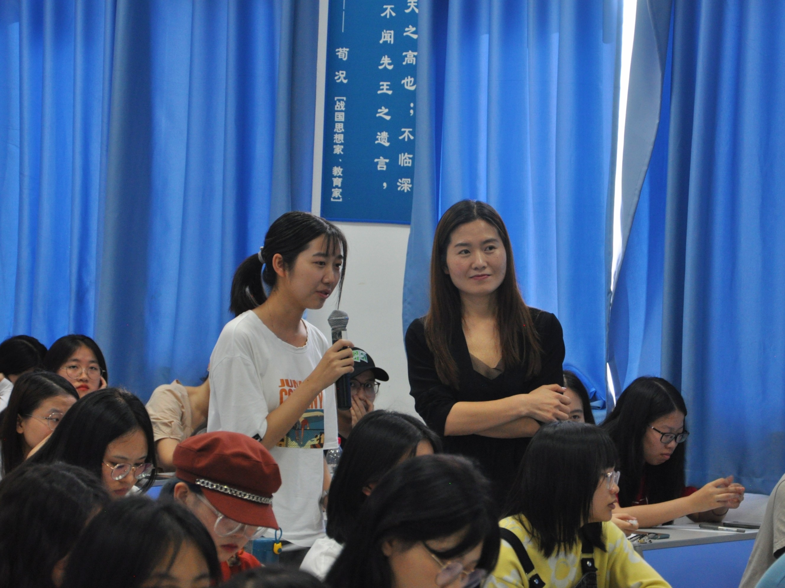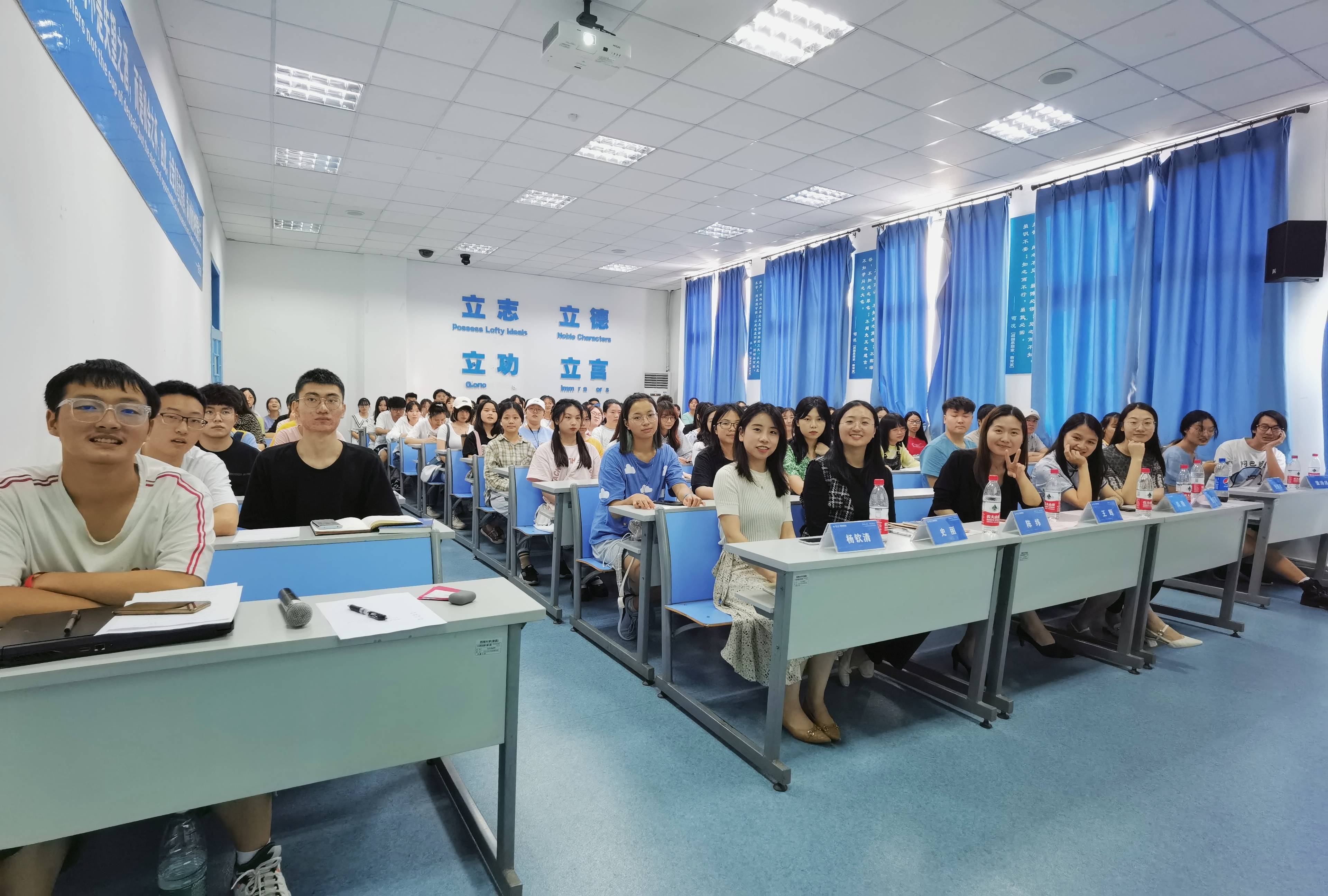 陈纬老师请同学们分享:我是一个什么样的人、我想成为一个什么样的人、我的人生目标是什么、我来了是为了什么这几个问题,团委书记肖颜老师也分享了自己的人生目标与感想。