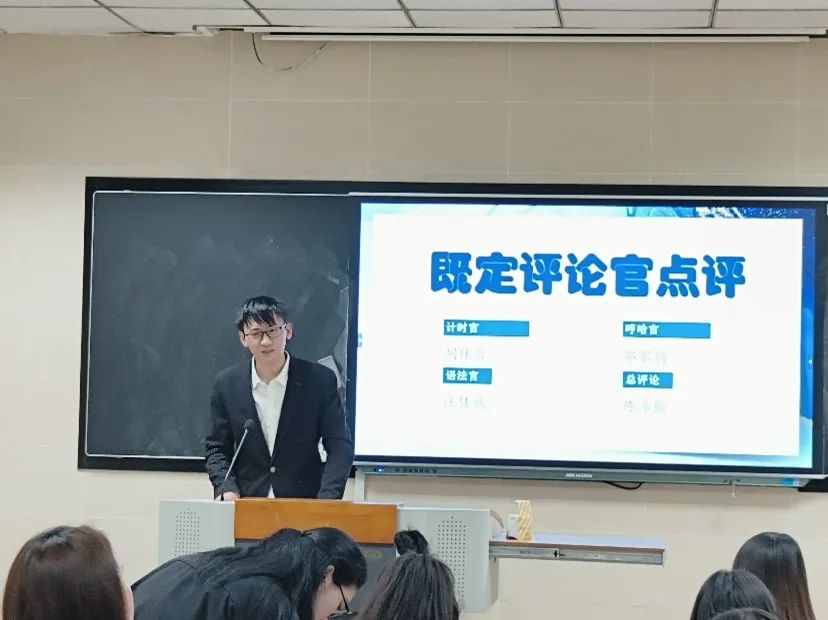 活动开展认真严谨的同时,又不失活泼有趣。起初同学们都正襟危坐,认真地欣赏三位既定演讲者的演讲风采,聆听他们激情澎湃的演讲;而首轮评论团队评论后,气氛逐渐变得活跃,同学们开始积极参与讨论环节,为踏上讲台展现自我做足准备。担任评论官的同学们对演讲者的优秀表现不吝赞美之词,为他们带来热情鼓励的同时也敢于指出他们的问题,帮助他们找到自己的不足。在最后的总评环节,各班通过投票评选出两位最佳演讲者和两位最佳评论官,活动就在欢声笑语中落下了帷幕。